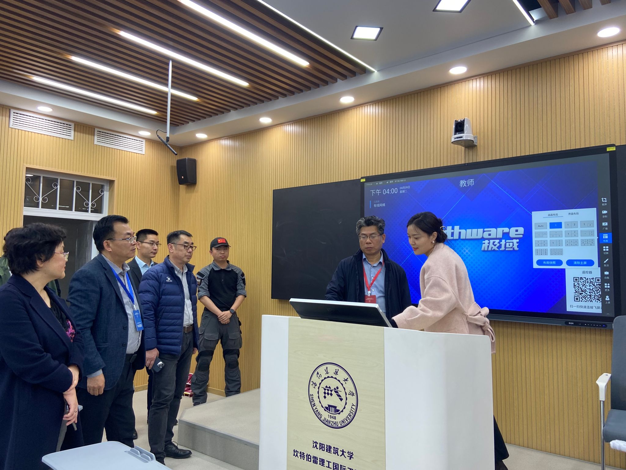 在丙2-501-2智慧教室,技术人员向评估专家介绍了教室的设施环境、结构布局、教学互动、教学资源共享与平台应用等相关情况和功能,演示了教室内所有设备物联网一键控制智慧化应用。在丙2-501-1智慧教室,技术人员向评估专家展示了与丙2-501-2智慧教室的教学观摩联动,以及其他主要功能。