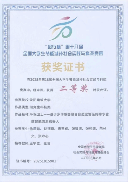在“招行杯”第十八届全国大学生节能减排社会实践与科技竞赛中,由我院学生赵钰泽参与的“环保卫士-基于多传感器融合自适应管径的排水管道智能清淤机器人”项目获国家级二等奖,创造了学院在此项赛事中的历史最佳成绩。该项目通过采用多传感器融合技术与自适应管径设计相结合,有效攻克了排水管道清淤作业中的多项技术难题。所研发的智能清淤机器人采用新型轮爪混合式自适应管径结构,结合自动化控制与机器人技术,实现了远程监控与整机运行管理的高效同步。